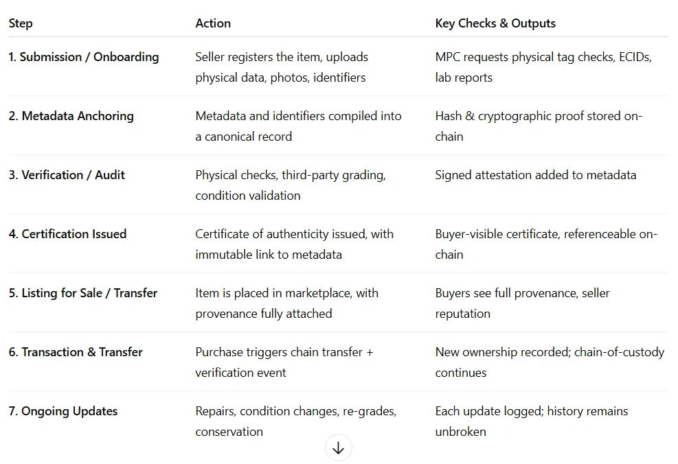 - Certification: Once approved, MPC issues a certificate of authenticity (digital and/or printable) anchored on-chain, linked to the physical collectible.